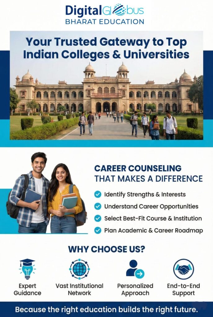 నేటి రోజుల్లో కోర్సుల సంఖ్య పెరిగింది… కాలేజీలు పెరిగాయి… కానీ సరైన సమాచారం, సరైన మార్గనిర్దేశం లేకపోవడంతో విద్యార్థులు తప్పు నిర్ణయాలు తీసుకునే ప్రమాదం కూడా పెరిగింది. ఒక చిన్న తప్పు నిర్ణయం జీవితాన్నే దారి తప్పించగలదన్న వాస్తవాన్ని గుర్తించిన డిజిటల్ గ్లోబస్, విద్యార్థి భవిష్యత్తును కేంద్రంగా పెట్టుకుని పనిచేస్తోంది.